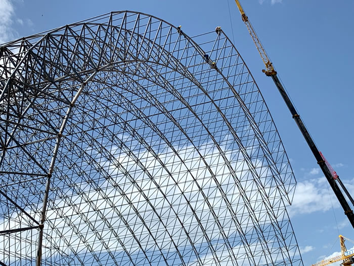 (2)网架加工前应对现场尺寸进行复测,确认无误后方可进行加工、安装;网架制作、运输、安装应遵守《空间网格结构技术规程》JGJ7-2010、《钢网架九台螺栓球节点》JG/T 10-2009、《钢网架九台螺栓球节点用高强度螺栓》 GB/T 16939-2016、《九台钢结构九台工程九台施工规范》 GB50755-2012、《九台钢结构九台工程九台施工质量验收标准》 GB50205-2020。